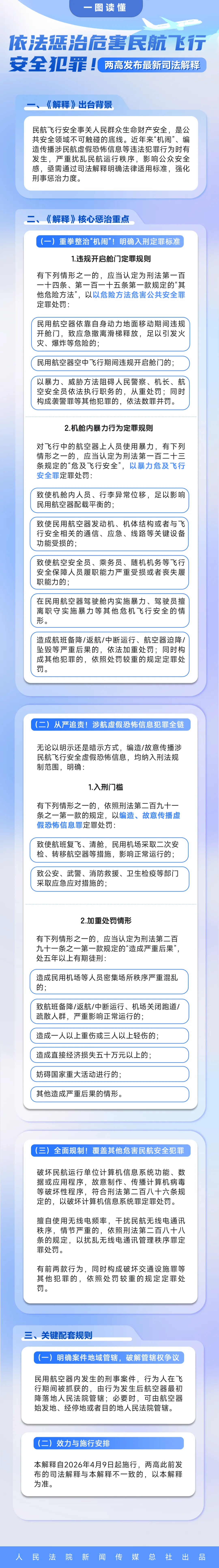 最高人民法院、最高人民检察院联合发布《关于办理危害民航飞行安全刑事案件适用法律若干问题的解释》(法释〔2026〕5号)。该《解释》已于2025年11月24日、2026年2月6日分别经最高法审判委员会、最高检检察委员会审议通过,自2026年4月9日起正式施行。重点内容有哪些?来,带你一图读懂!