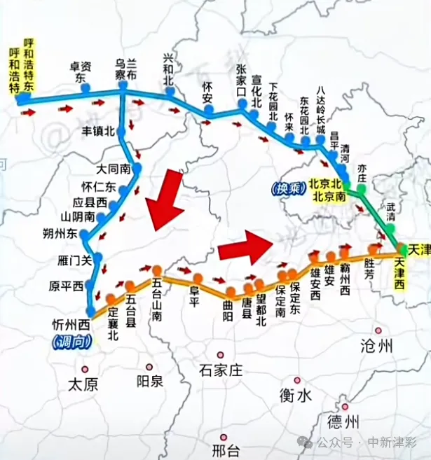 这条设计时速350km/h的雄忻高铁,串联起雄安新区与山西忻州,待雄忻高铁与集大原高铁全线贯通后,呼和浩特将实现高铁直达天津,全程仅需约2.5-3小时,全程无需换乘!