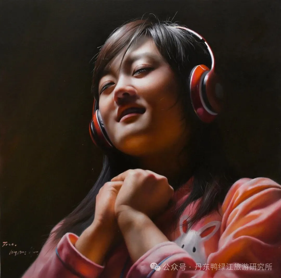 白明学的超写实画风谋求体系化的精密建构,代表着当代朝鲜油画技艺的高峰。他沿用古典油画多层罩染技法,以透明色层反复叠加、缓慢渲染,使画面色彩温润通透、层次深邃绵长。在人物肖像创作中,他对皮肤质感的处理达到显微级精度,毛细血管的隐现、肌理的细微起伏、光影在软组织上的微妙过渡,都被精准捕捉,实现 “触手可及” 的生理真实。面部、衣物、毛发、织物等质感表现更是其技艺亮点,每一种物象都拥有专属的视觉质感与触觉联想。他高度弱化笔触痕迹,追求平整、细腻的视觉效果,近乎消除绘画行为的过程痕迹,让物象以 “本然状态” 呈现。这种 “无笔触” 处理,为超写实的拟真感服务,让绘画直面物象本身,产生某帅视觉追问和视觉沉浸。构图上,他采用稳定简洁的结构,多以居中肖像、特写镜头与虚化背景突出主体,将所有视觉力量集中于人物神态与物象细节,这种以技载道、以精求真的语言体系,使他的超写实作品有科学般的精确性与视觉读取效果。