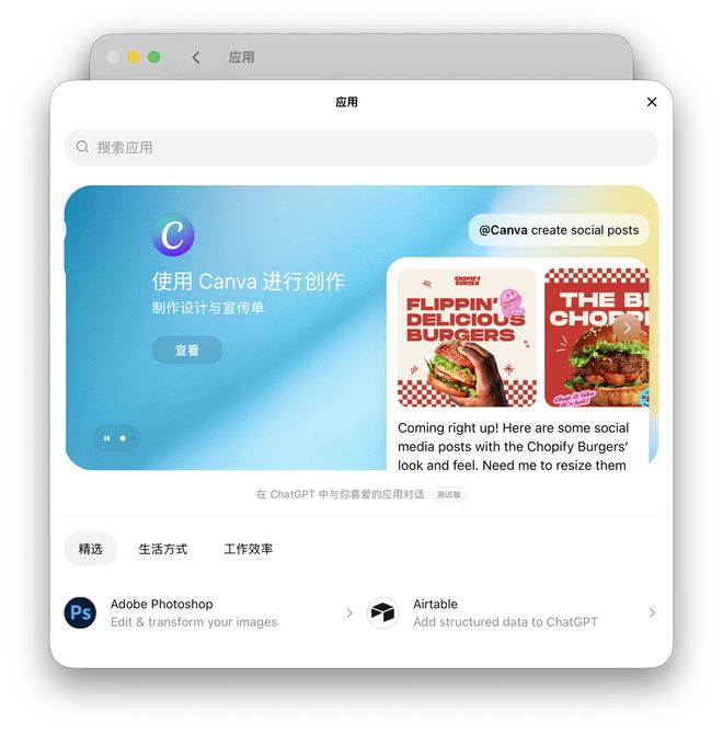 先讲讲 ChatGPT 的桌面端,它已经不只是一个对话窗口,同时也在尝试打造一个以 ChatGPT 为核心的应用生态。在实际使用中,可以直接调用 macOS 本地应用,也可以接入一批已经打通的第三方工具,比如 Adobe Photoshop、Canva、Figma、Apple Music、OpenTable 等。