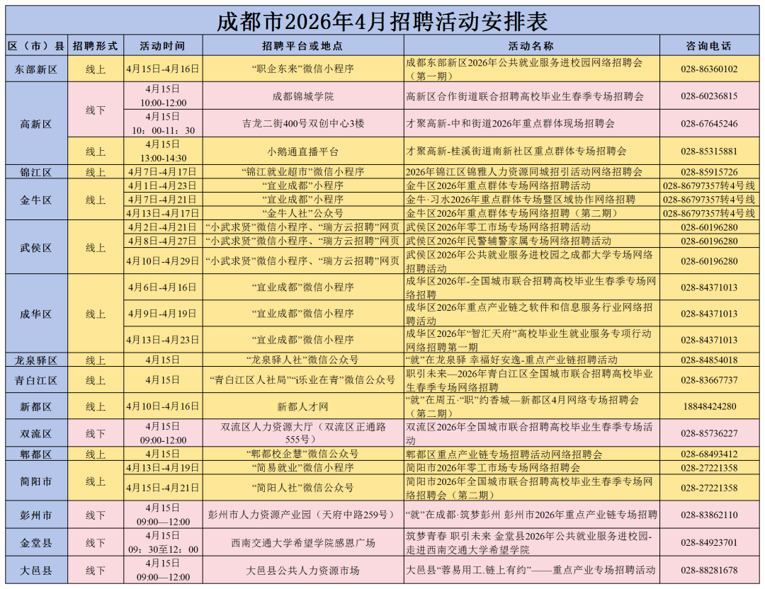 今日,成都一系列线上招聘活动密集开展,具体招聘信息如下表,请大家留意场次安排,提前做好准备。温馨提示:近期,“宜业成都”小程序维护中,如出现搜索不到的情况,可通过“成都人社局”微信公众号点击微服务一就业经办栏目进入。招聘活动可能因天气、场地等因素临时调整,为确保您顺利参会,建议提前拨打活动预留电话确认详情。