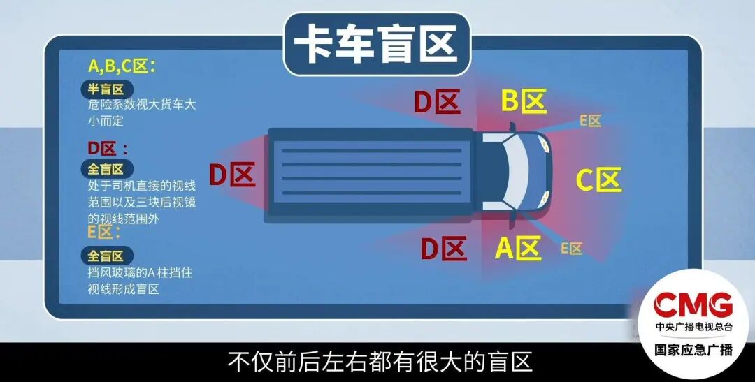 车体越宽、越高,车辆盲区范围就越大。货车的半盲区与全盲区都禁止停留。