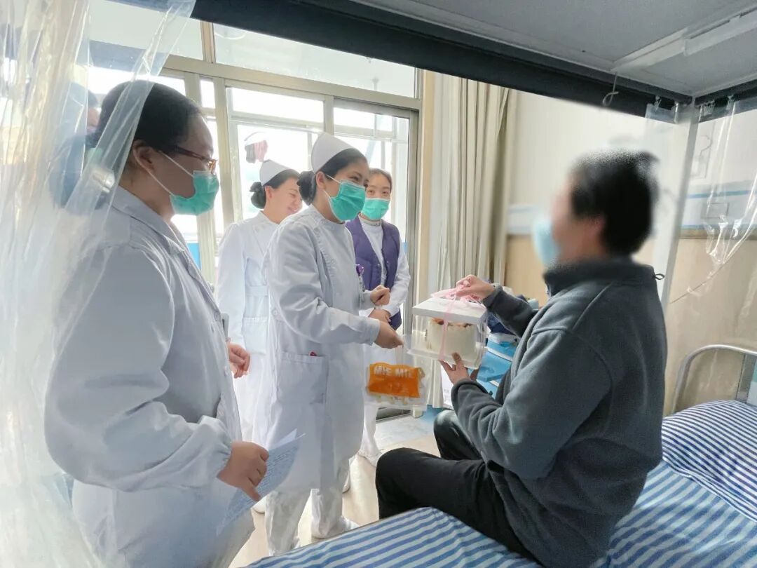2019年2月底,陆先生旧病复发,正经历第四次化疗。药物反应剧烈,血小板极低,又恰逢感冒发烧,身体与精神都跌入谷底。家人无法时刻陪伴,独自躺在病床上的他,看着邻床家人相伴,倍感孤独低落。就在这时,下班脱下护士服、换上红格子上衣的富佳婧,捧着蛋糕、碧根果、葡萄干,笑意盈盈走到床边,轻声道:“陆老师,祝你生日快乐!”