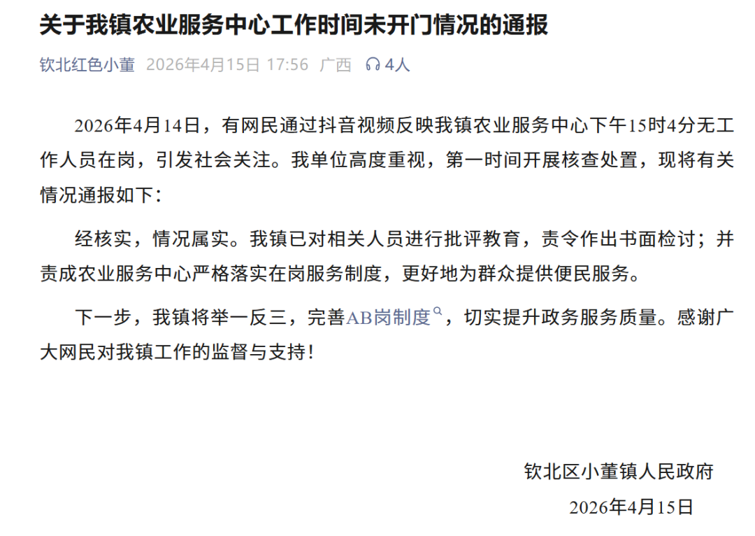 4月15日,广西钦州市钦北区小董镇人民政府发布《关于小董镇农业服务中心工作时间未开门情况的通报》: