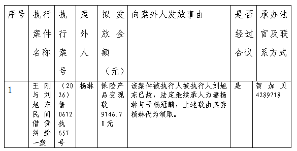 为进一步严格执行案款管理,规范执行案款发放程序,确保执行案款发放安全,根据最高人民法院《关于执行款物管理工作的规定》等相关规定要求,现对以下执行案款发放事宜进行公示,公示期为三个自然日(2026年4月17日-4月19日),案件当事人或者其他利害关系人如有异议应当在公示期内提出并提交相关证据材料,公示期满无异议的,本院将按照执行案款管理的相关规定办理发放手续。