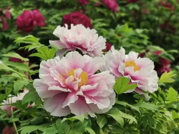 神州牡丹园:全园共有约530个品种牡丹开放,主要分布在牡丹文化区、花舞神州、盛世花海、牡丹精品区、百年牡丹林等处。其中:盛开的牡丹品种有黑夫人、九天揽月、天鹅绒、观音面、贵妃插翠、赵粉、魏紫、富贵满堂、宫样妆、醉西施、迎日红、绿幕隐玉、紫瑶台、蝴蝶报春、春柳、二乔、岛锦、蓝海碧波等;初开的牡丹品种有:黑海撒金、乌金耀辉、嫦娥奔月、金桂飘香、青龙卧墨池、首案红、荷花绿、麻姑献寿、冰凌罩红石、彩绘、美艳、瑶池研墨等。园内棣棠、樱花等竞相绽放。