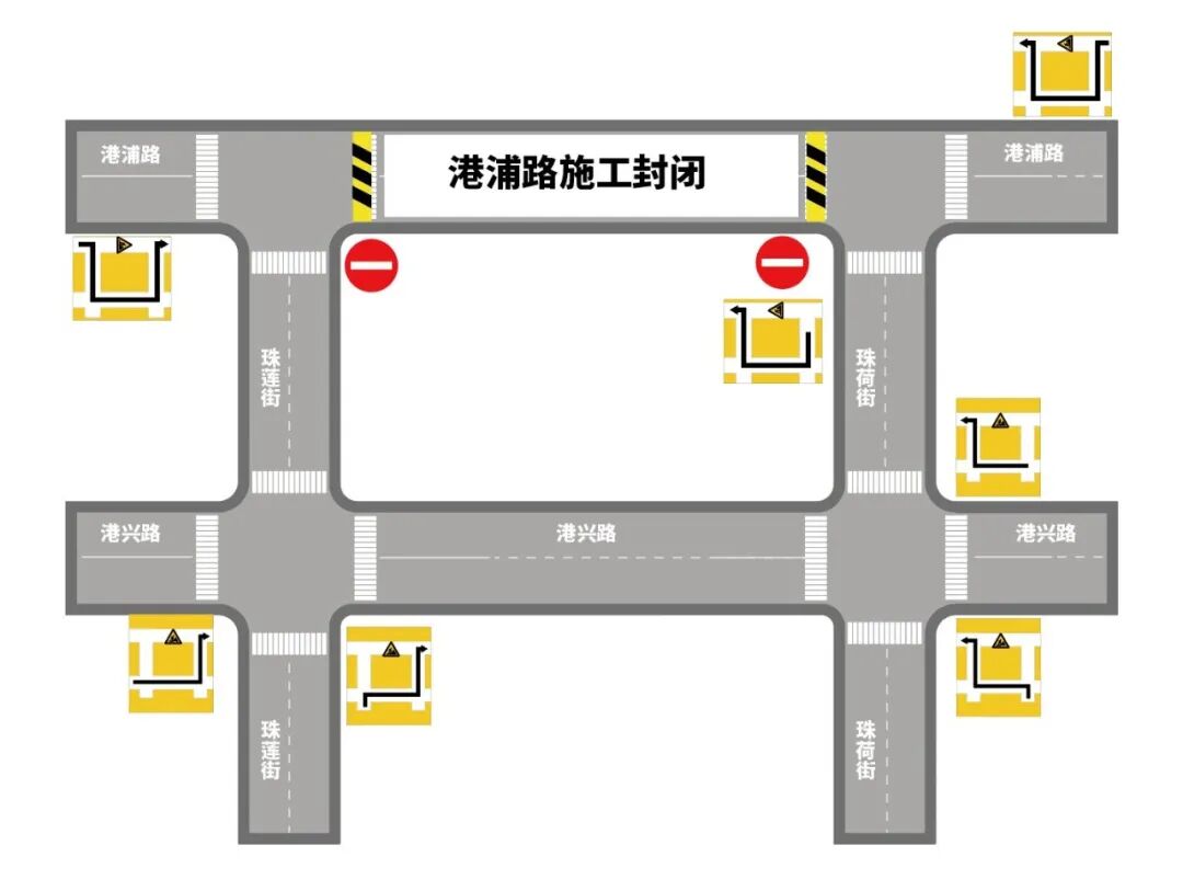 施工期间,途经车辆可选择珠荷街、港兴路、珠莲街绕行,请按照现场道路交通标志和工作人员指示通行,如遇特殊情况,封闭时间动态调整,以现场道路标志为准。