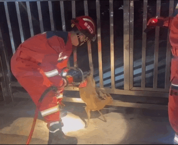 2024年5月10日凌晨3时26分,浙江杭州淳安县一只野生动物被卡小区铁门。消防员抵达现场后发现,被卡在铁门的是一只野生黄麂,属于国家二级保护动物,消防救援人员在做好个人防护后,用液压扩张器将卡住黄麂腿部的铁柱慢慢撑开,脱困后的黄麂沿着山路逃走了。