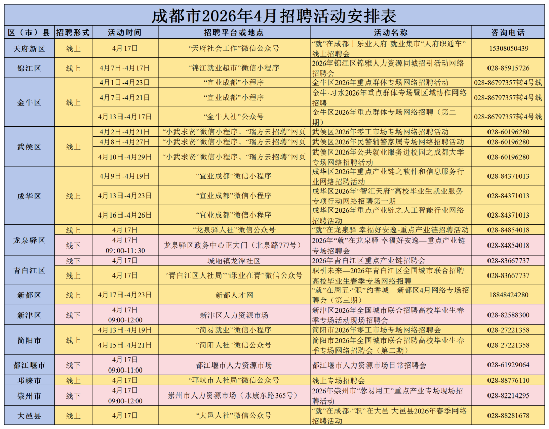 今日,成都一系列线上招聘活动密集开展,具体招聘信息如下表,请大家留意场次安排,提前做好准备。温馨提示:近期,“宜业成都”小程序维护中,如出现搜索不到的情况,可通过“成都人社局”微信公众号点击微服务一就业经办栏目进入。招聘活动可能因天气、场地等因素临时调整,为确保您顺利参会,建议提前拨打活动预留电话确认详情。