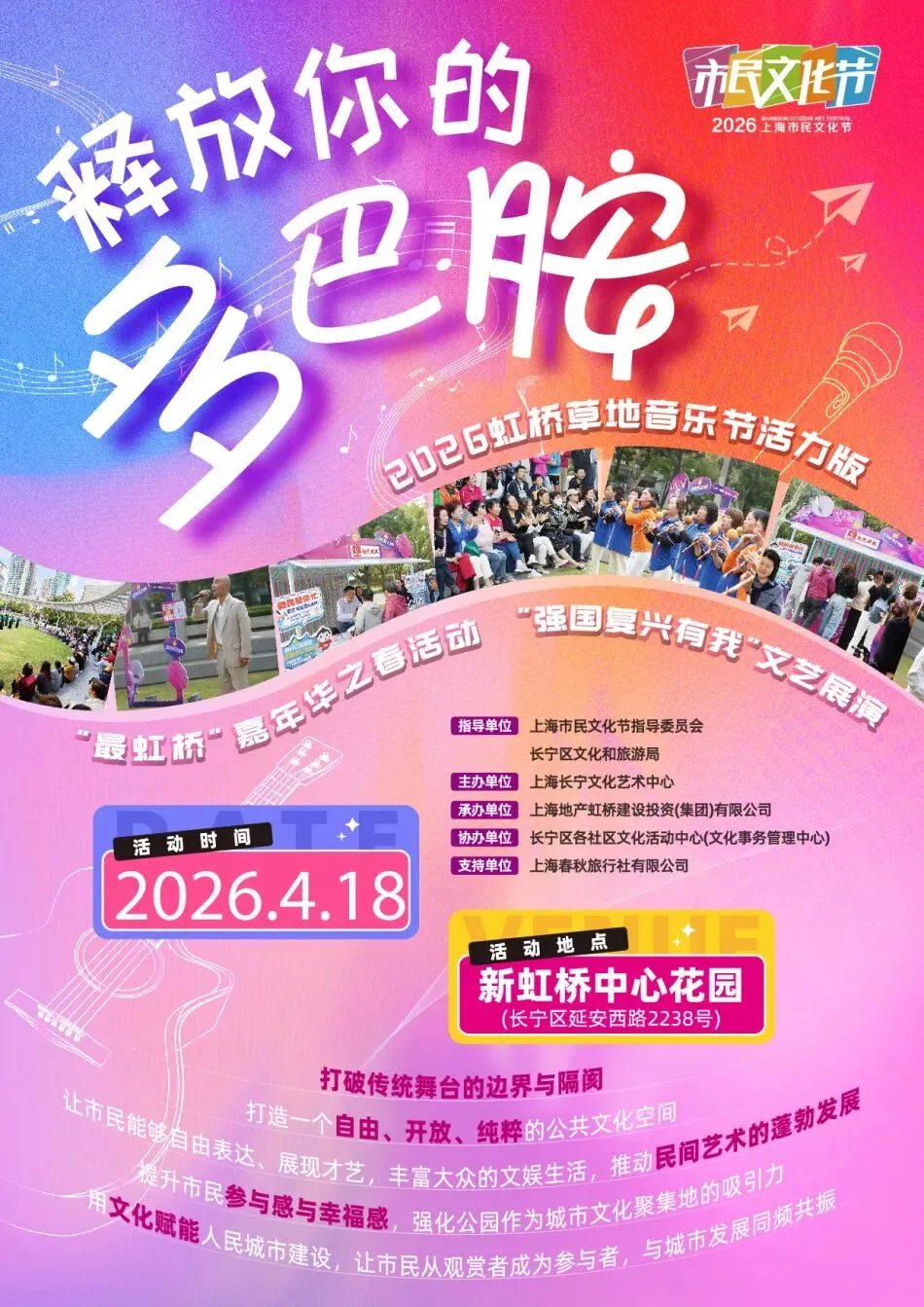 本次活动作为长宁文旅“艺术可沉浸”活力提升计划重要实践,紧扣上海市民文化节“人民城市 人人出彩”核心主题,以“释放你的多巴胺”为鲜明特色,打破传统舞台壁垒与观演边界。通过沉浸式、强互动的多元文化体验,推动观众从观摩倾听者转变为深度参与者,实现观演者与表演者的角色互换,让市民在自由开放的公共文化空间中尽情展现风采、释放活力,在艺术浸润中提升精神获得感,与城市文化发展同频共振。