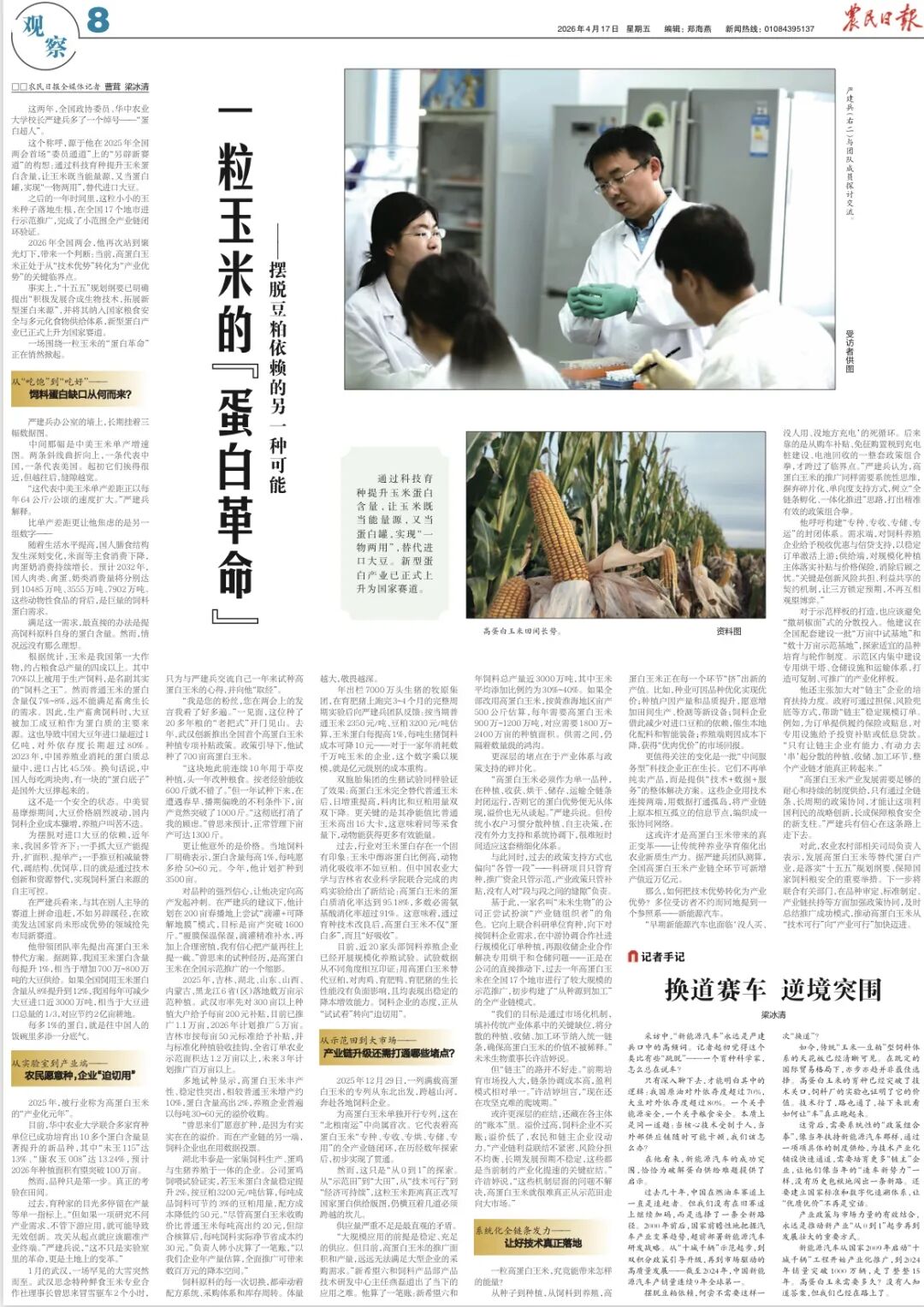 “高蛋白玉米产业发展需要足够的耐心和持续的制度供给,只有通过全链条、长周期的政策协同,才能让这项利国利民的战略创新,长成保障粮食安全的新支柱。”严建兵有信心在这条路上走下去。