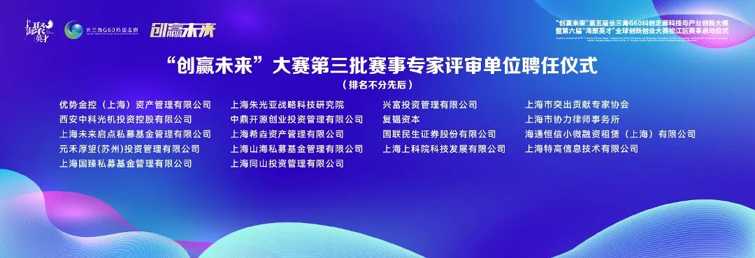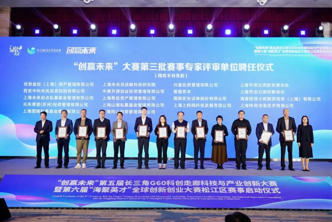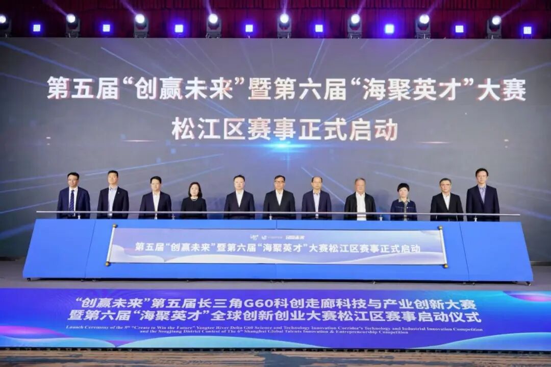 刘福升、李祖兴、黄勇、瞿秋平、上海市民政局市银发经济工作专班蔡璇璇、松江区委组织部副部长、区人才局局长吕颖群、G60创新研究中心主任贾占锋、建设银行松江支行行长李剑峰、上海科创集团引导基金部总经理鞠铭、国泰海通证券投行部董事韩文奇、毕马威中国G60项目主管合伙人徐海峰等共同启动第五届“创赢未来”大赛和第六届“海聚英才”大赛松江区赛事。