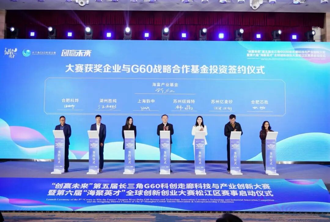 G60科技成果转化基金管理人——海富产业基金与苏州纽姆特纳米科技有限公司、苏州亿麦矽半导体技术有限公司、湖州胜纯应用材料有限公司、合肥芯胜半导体有限公司、合肥科烨电物理设备制造有限公司、上海韵申科技有限公司等大赛获奖企业签订基金投资协议。