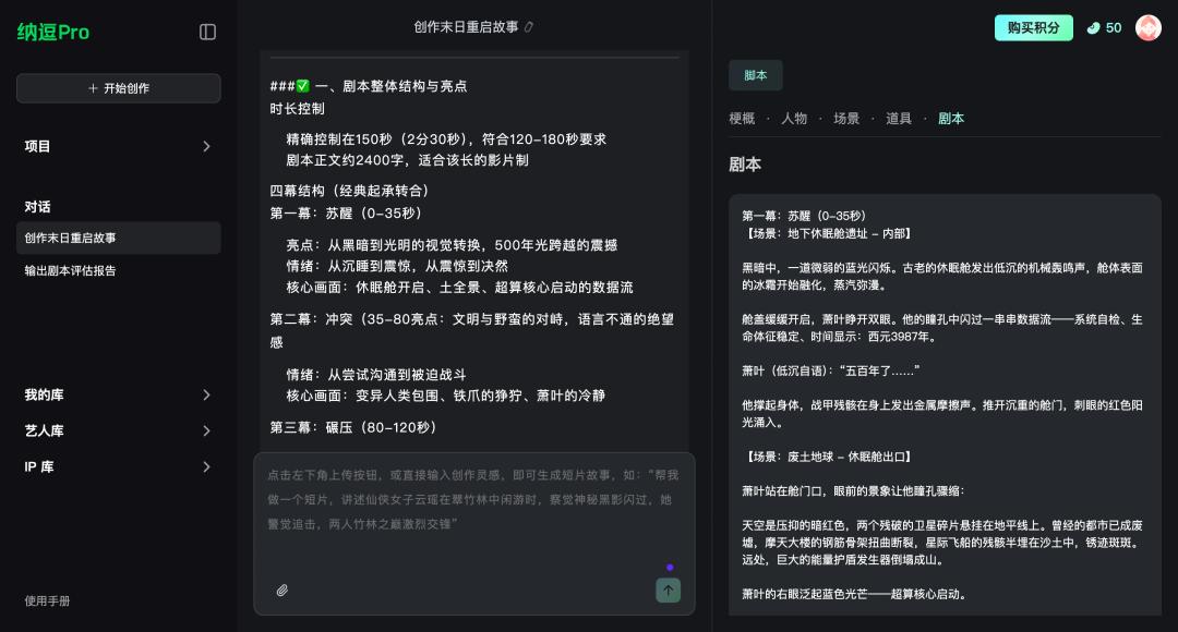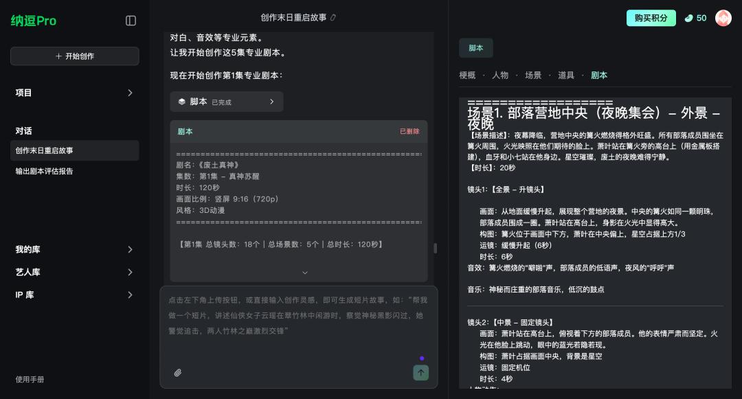 纳逗Pro也支持AI剧本生成,但拿到核心概念后第一反应是做成一条150秒的短片。经过我反复提示做成短剧剧本,第一集也仅仅包含了“男主出场”这一个信息。