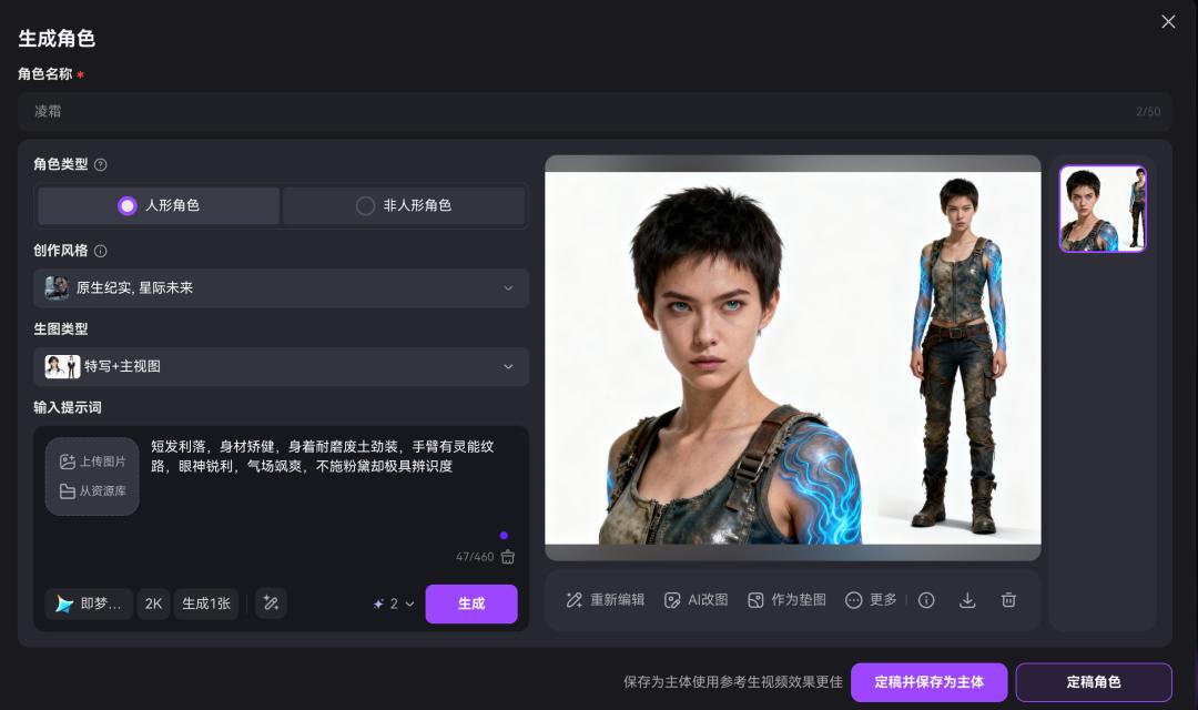 角色倒是考虑到了简单的正邪对抗,并且自动补上了男女主情感线。但一键生成的角色图,可以说和剧本设定两模两样。