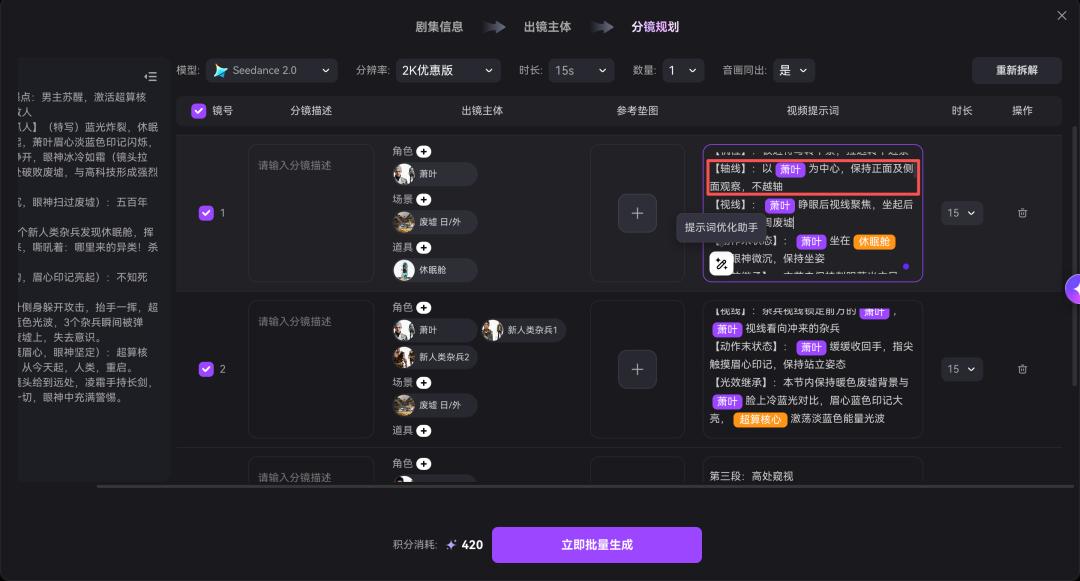 随后,Agent根据剧本自动拆分分镜并生成画面提示词,用户可以自己调试尺寸、单镜头生成数量、增删分镜。