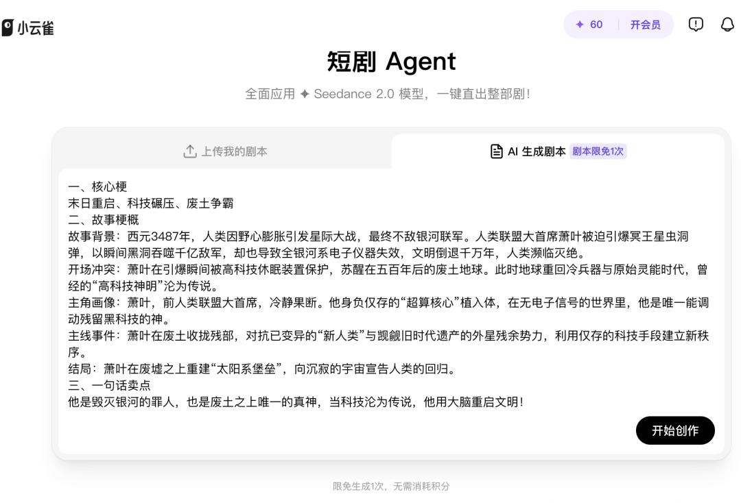 这批大厂Agent中,小云雀是唯一真正支持“一句话生成剧本”的平台,首次AI生成剧本免费。