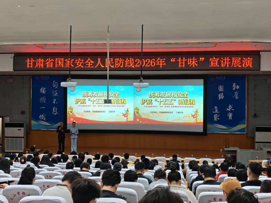 4月13日,学校联合甘肃省国家安全厅举办甘肃省国家安全人民防线2026年“甘味”宣讲展演活动。宣讲团成员紧扣总体国家安全观,结合工作实际与典型案例,用“接地气”的语言讲“硬核”道理—既有法律条文的精准解读,又有真实案例的深度剖析;既讲国际形势的复杂严峻,也聊日常生活中的安全细节,为师生呈现了一堂主题鲜明、内容鲜活、感染力强的国家安全必修课,现场反响热烈,“国家安全无小事”的理念已悄然扎进了每一位师生的心里。