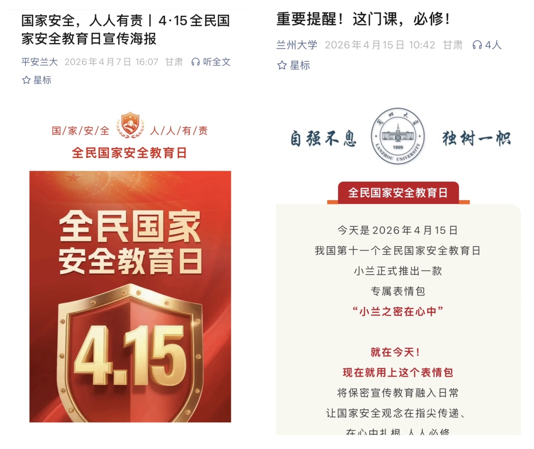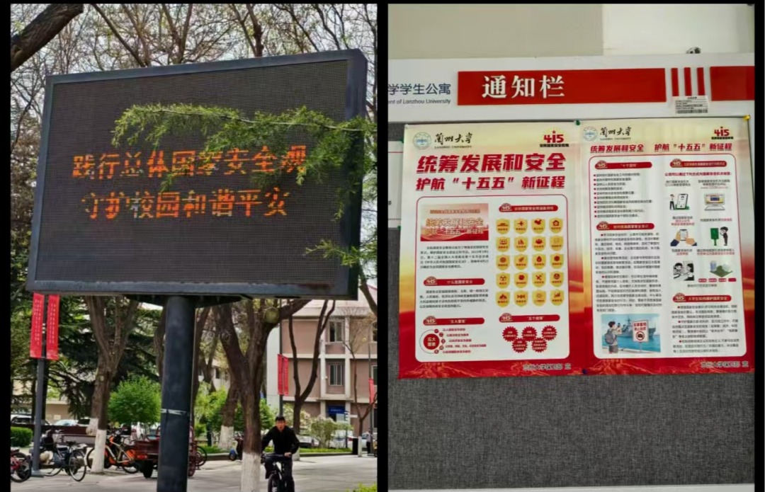 活动期间,学校线上线下联动、多平台协同发力,持续扩大宣传覆盖面。在各校区教学楼、食堂等重点区域张贴主题海报,校园电子屏滚动播放宣传标语;依托“平安兰大”及学校官方新媒体平台,常态化推送国家安全常识与科普内容;各学院结合实际,组织开展主题班会、集中观看国家安全教育思政大课等活动,推动国家安全教育进班级、进课堂、进头脑。