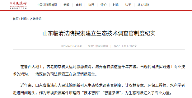 4月15日,《中国法院网》以《山东临清法院探索建立生态技术调查官制度纪实》为题,报道临清法院环资审判工作。