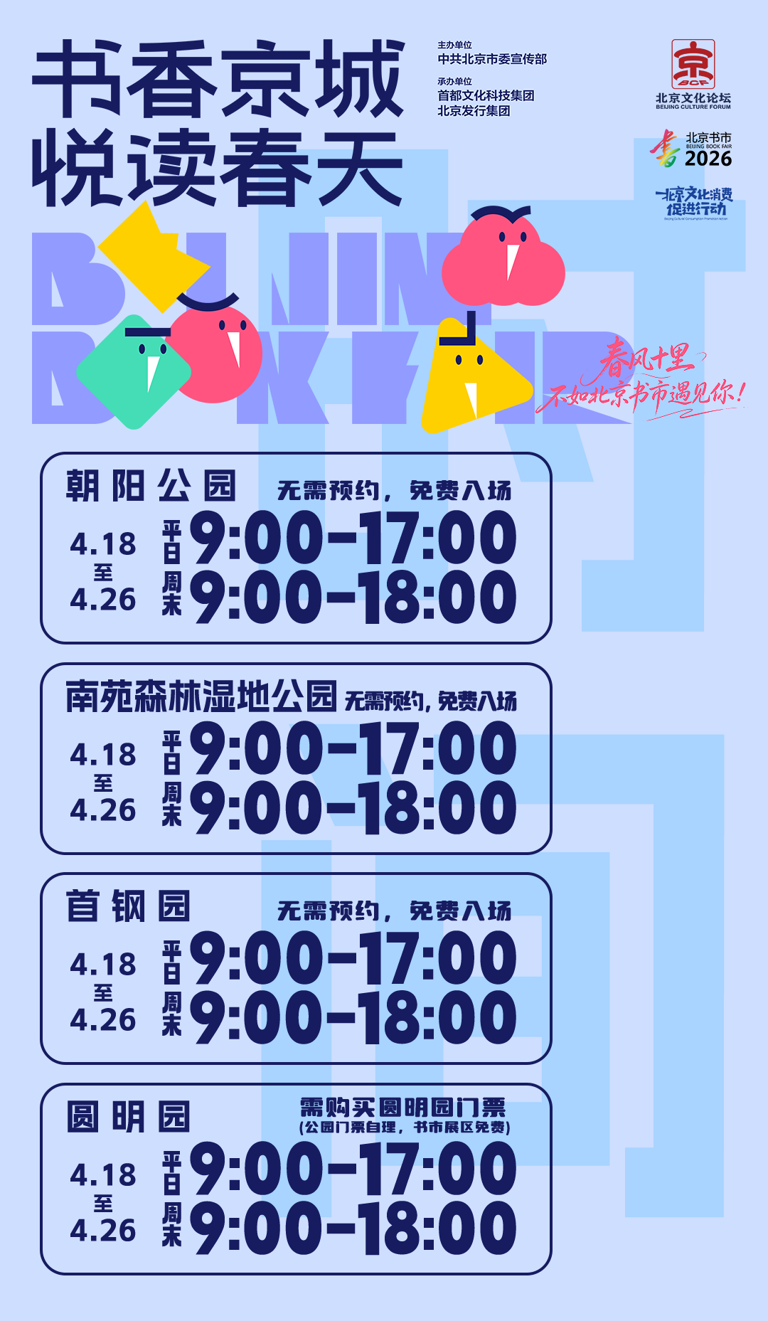 “春风十里,不如北京书市遇见你!”2026北京书市将于4月18日至5月17日盛大开启,以“书香京城 悦读春天”为主题,跨越“五一”小长假,为市民奉上一场跨度长达一个月、书香弥漫全城的春日文化盛宴。