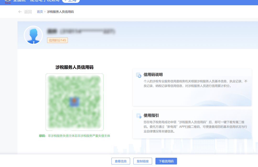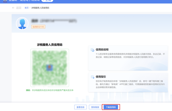 5.点击“下载信用码”,可以下载涉税服务人员信用码,扫描二维码可查看涉税服务人员的详细信息。