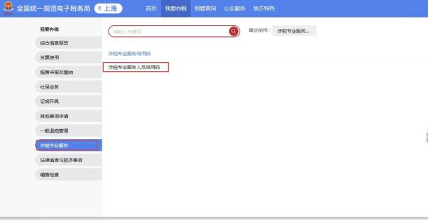 1.涉税服务人员通过“自然人业务”方式登录电子税务局后,可通过【我要办税】-【涉税专业服务】-【涉税服务人员信用码】进入功能。