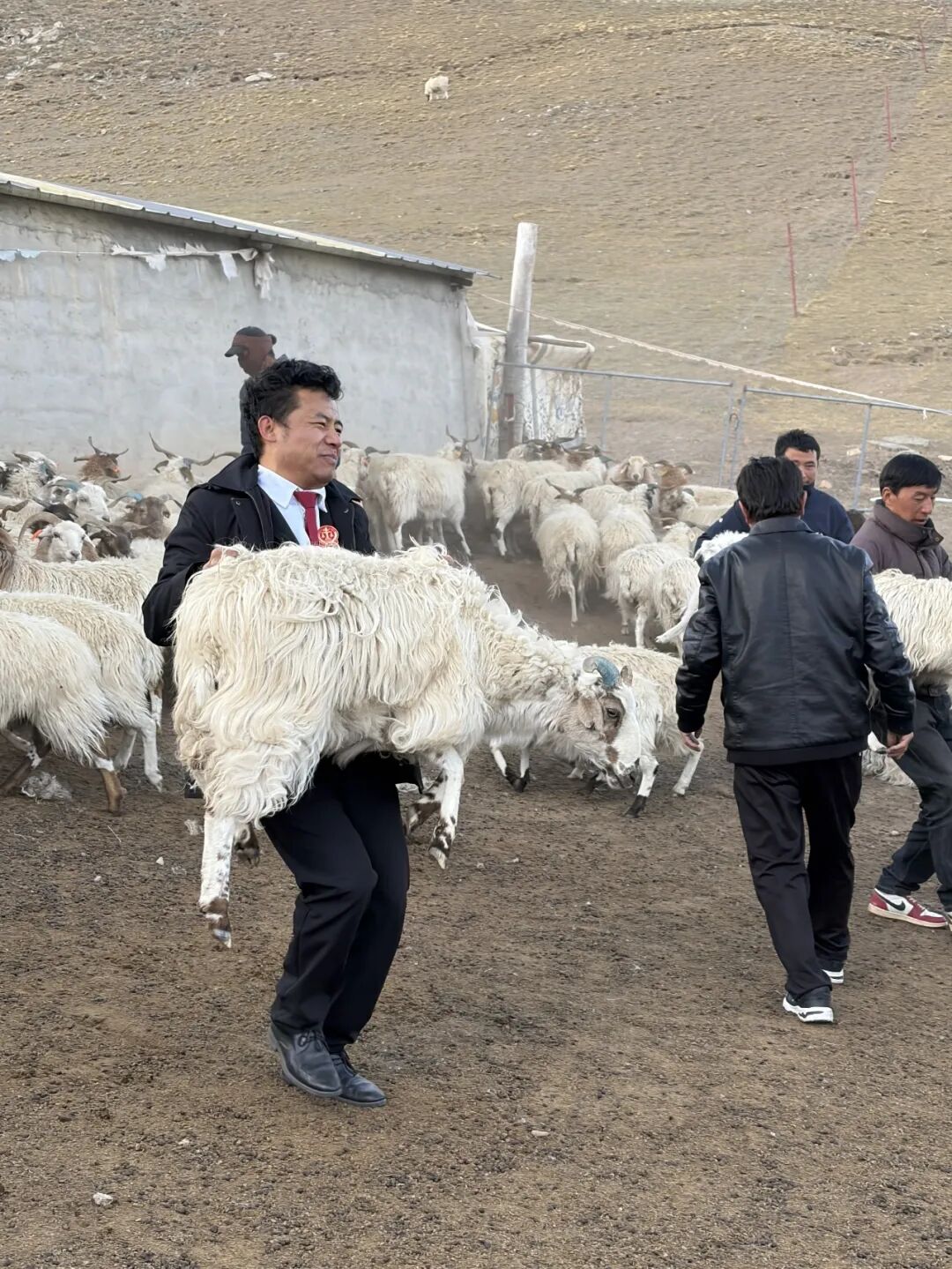 到了扎西家的圈舍,正赶上他爸忙着清点转场的羊群,人手不够,羊只受惊乱跑。看着他爸急得满头汗,我们没多说什么,撸起袖子就上手帮忙。我扛起这只羊的时候,才真切感受到了牧民生活的重量:羊毛上还沾着草原的尘土,羊身的分量压在肩头,就像牧民一辈子的生计与期盼。那一刻,我不再只是一个坐在审判席上的法官,而是帮老乡搭把手的亲人。