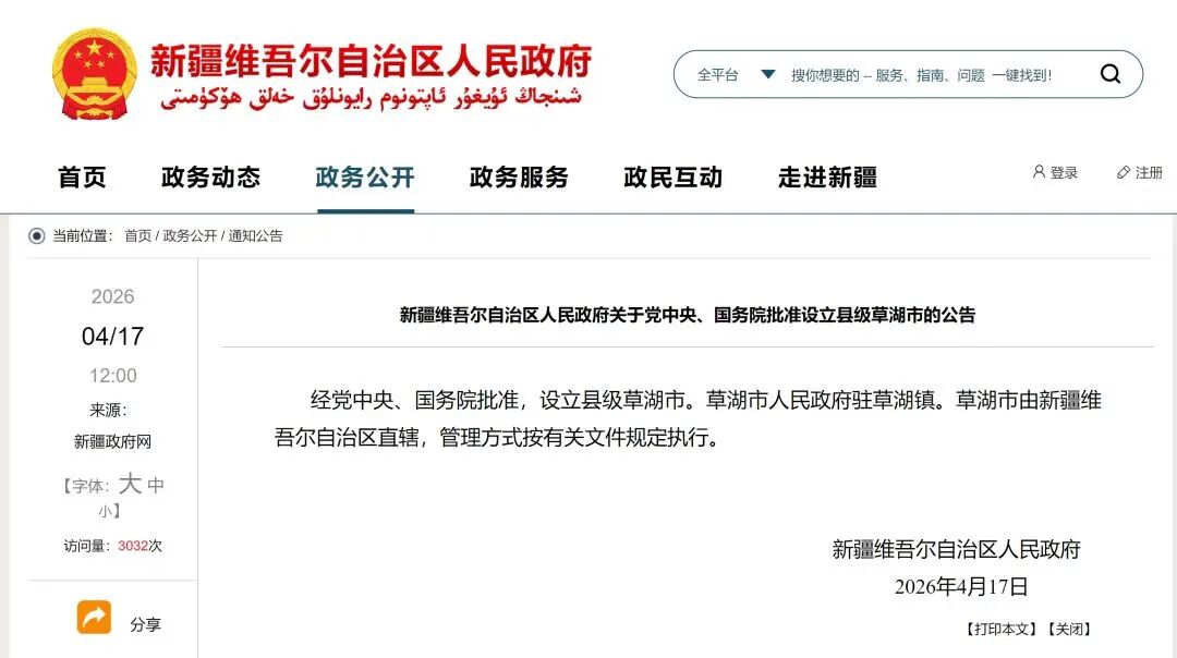 新疆维吾尔自治区人民政府17日发布:经党中央、国务院批准,设立县级草湖市。草湖市人民政府驻草湖镇。草湖市由新疆维吾尔自治区直辖,管理方式按有关文件规定执行。