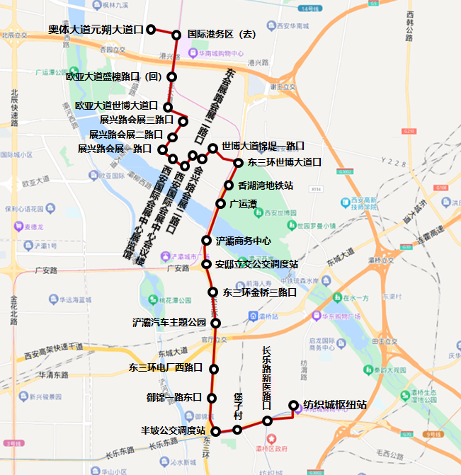 新增站点(23个):纺织城枢纽站、长乐路纺渭路口(回)、西柳瑞路曹堡路口、西柳瑞路席王路口、铁一中滨河校区、西柳瑞路灞瑞一路口、西柳瑞路柳烟路口(回)、柳烟路普华浅水湾、三十四中、灞桥、世博园得宝门、读书村北、世博大道香湖湾一路口、世博园锦绣门、香湖湾、雾庄、雾庄立交北(回)、郝家村、陆东村、浐灞国际港管委会南门、新筑路港丰路口、和祥路港丰路口、和顺路港丰路口。