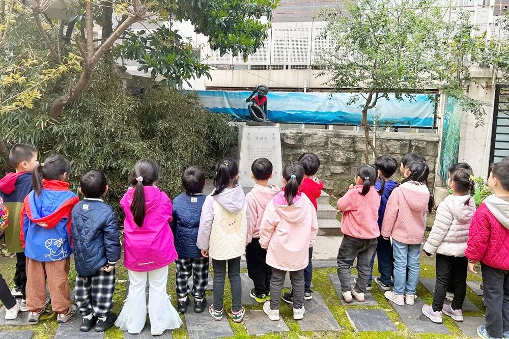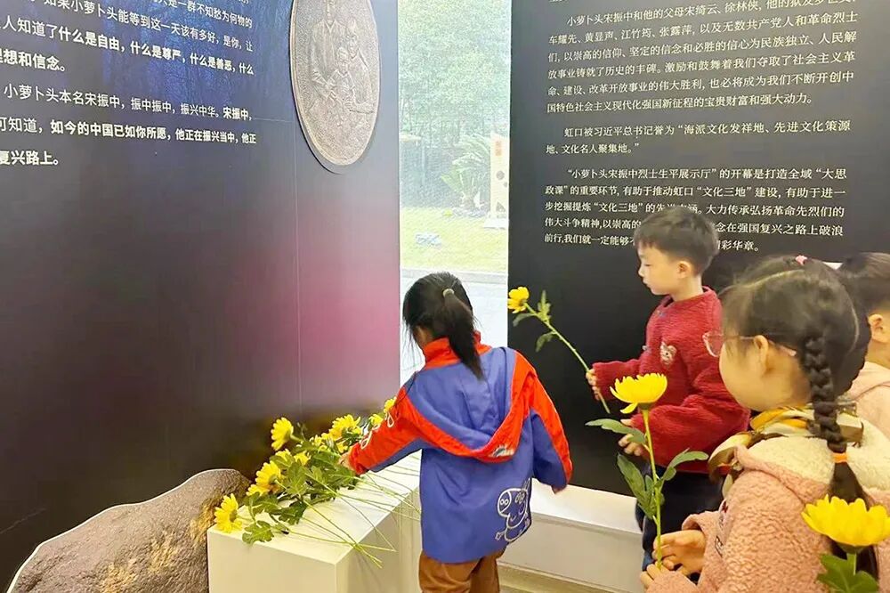 在教师的带领下,虹口区幼儿园的小朋友们来到虹口区青少年活动中心爱国主义教育基地——“小萝卜头”宋振中烈士生平展示厅开展清明祭英烈活动,在幼小的心灵中播撒革命火种。在青少中心讲解老师的深情引领下,孩子们静静聆听“小萝卜头”宋振中的英雄事迹。孩子们怀着虔诚之心,抚摸着小烈士的塑像,亲手将鲜花轻轻放在“小萝卜头”烈士画像前,弯腰鞠躬,用最纯真的方式,寄托对小烈士的深切缅怀与无限敬意。此次活动,不仅让孩子们在潜移默化中接受了红色精神的滋养,懂得了珍惜当下的幸福生活,更在他们心中播下了爱国爱党的种子。