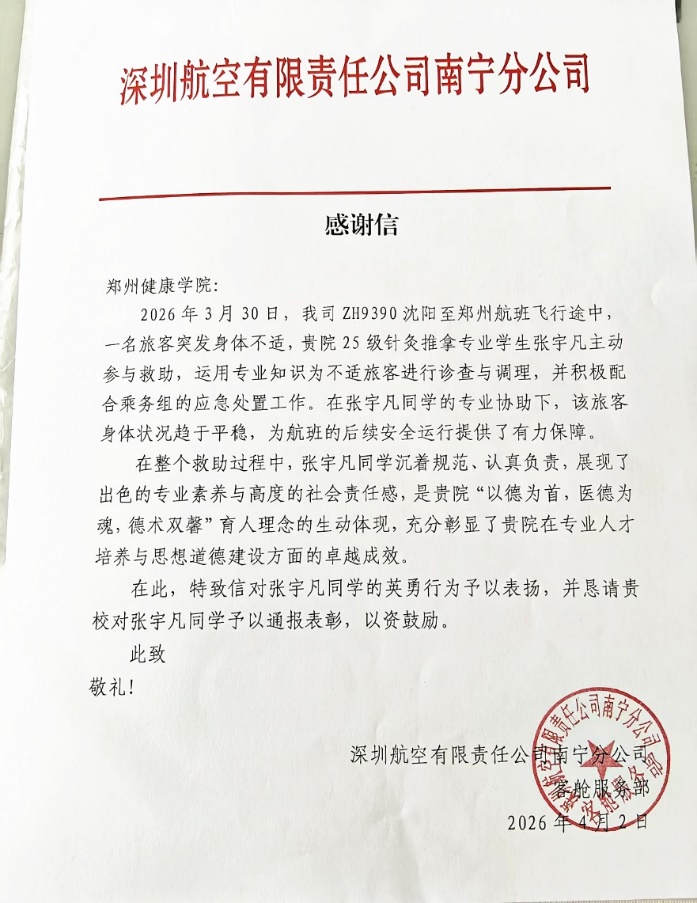 险情解除后,被救旅客谭女士心怀感激,特意定制锦旗、录制感谢视频,向张宇凡致以最诚挚的谢意。深圳航空南宁分公司也专门致信郑州健康学院,高度赞扬张宇凡同学沉着规范、认真负责,称赞其行为是学校“以德为首,医德为魂,德术双馨”育人理念的生动体现。
