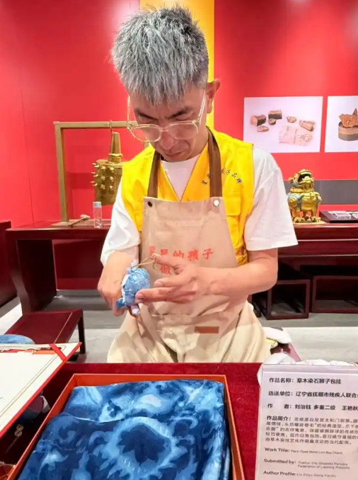 在非遗草木染展区,一方靛蓝扎染丝巾在聚光灯下泛着星辰般的光泽,王卫军正用略显笨拙的双手,仔细整理着丝巾,因身体不便,只是简单挪动几下,他便已是满头大汗。