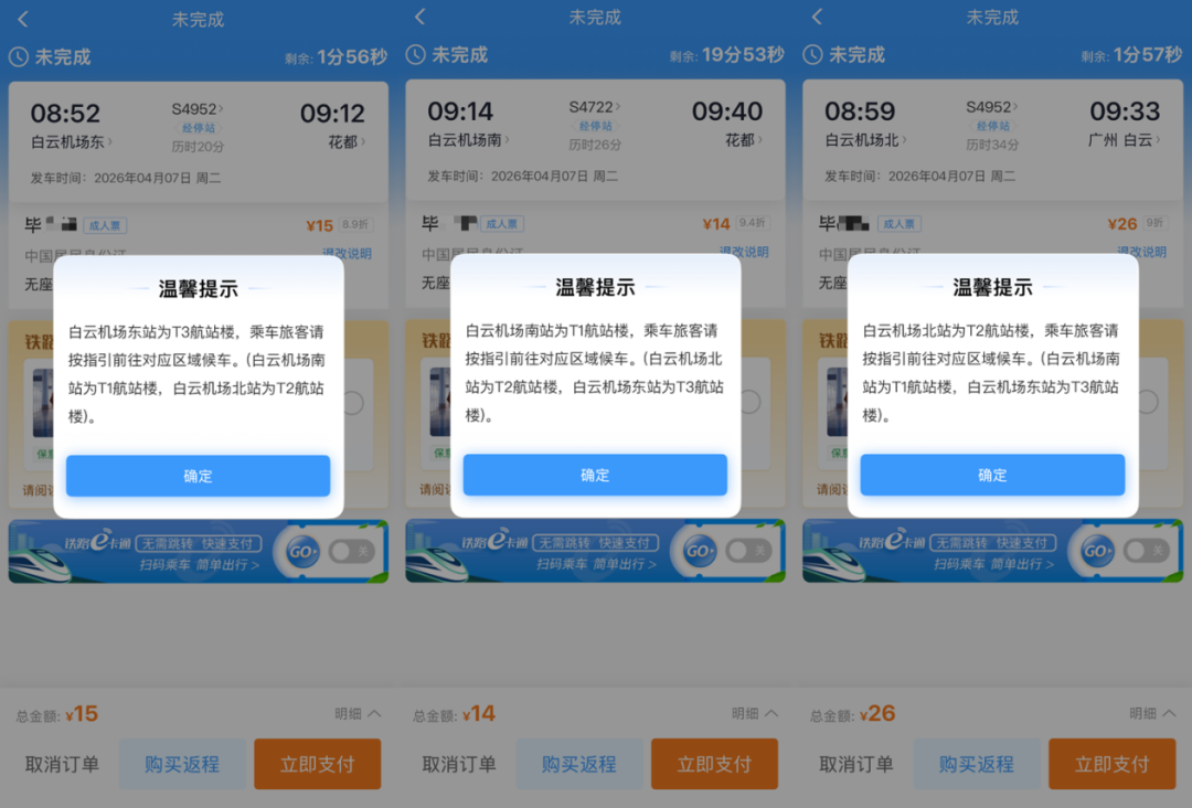 广州地铁还针对白云机场三座城际铁路车站的指引服务进行了优化,为方便旅客辨识白云机场三个航站楼、避免“误乘误下”,在铁路12306系统购票界面上线了提示功能。旅客在购买出发或到达城际白云机场东站(T3)、白云机场南站(T1)、白云机场北站(T2)的车票时,系统将在支付前自动弹出提示框,提醒所对应的具体航站楼信息。同时,广州地铁APP也同步优化了地图和“城际出行助手”中的站名显示,新增T3、T1、T2航站楼标注,方便旅客选择合适的车站。