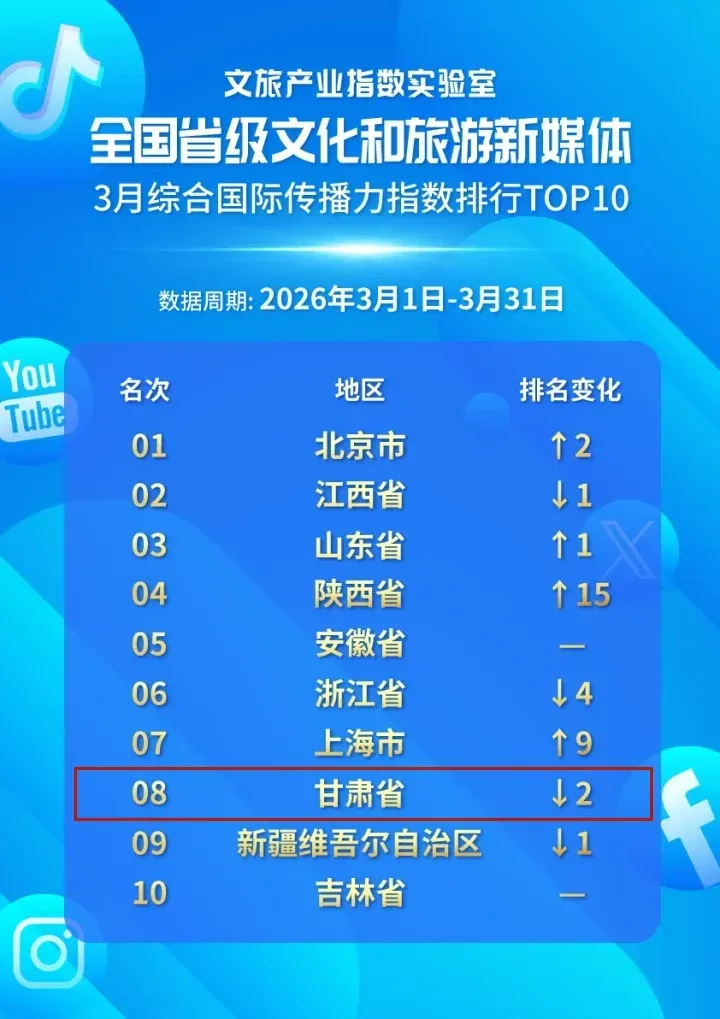 文旅产业指数实验室近日发布2026年3月全国省级文化和旅游新媒体国际传播力指数报告,甘肃4项上榜。其中在综合国际传播力指数排名第8,在Facebook传播力指数排名第3,在X传播力指数排名第7,在Instagram传播力指数排名第9。