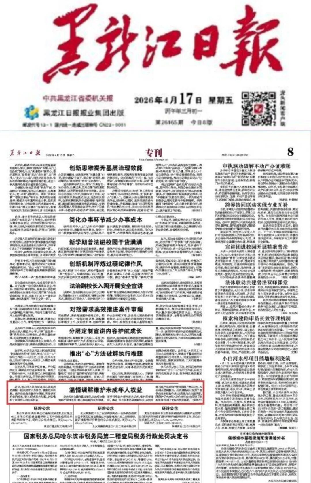 4月16日,密山市人民法院宫照万撰写的《温情调解维护未成年人权益》一文,刊发于《黑龙江日报》第八版专刊。