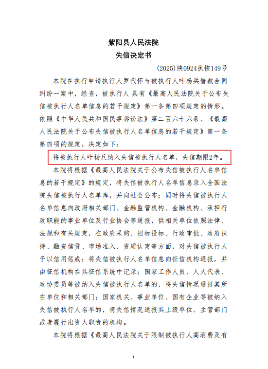 被执行人叶杨兵,你因不履行判决书所确定的义务,已被紫阳县人民法院纳入失信被执行人名单库依法进行信用惩戒。信用惩戒范围包括但不限于以下措施: