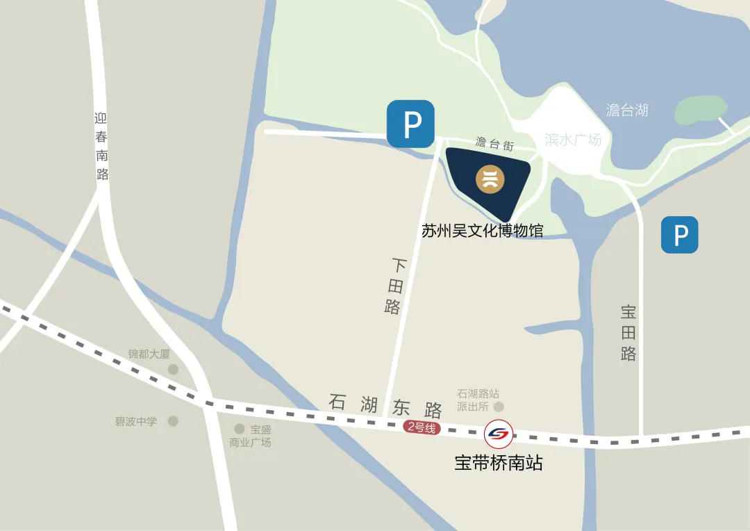 您可停车至博物馆东侧的宝田街停车场或西侧的下田路停车场;因周边停车位有限,也推荐您选择打车、地铁(2号线宝带桥南站)或公交(66路宝带桥南站)出行。