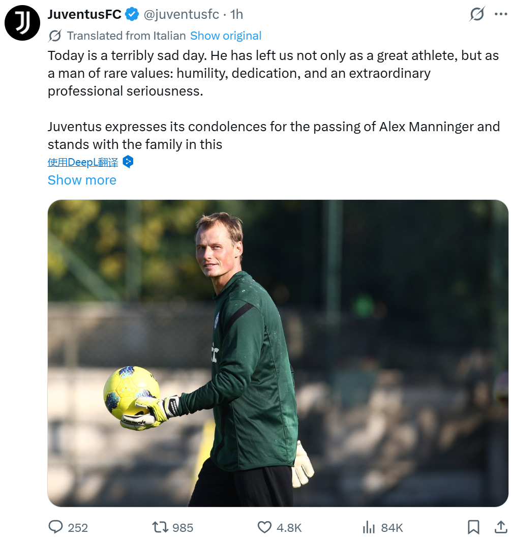 阿森纳、尤文图斯等俱乐部官方社交媒体也相继发文,深切悼念昔日门将亚历山大·曼宁格的离世。