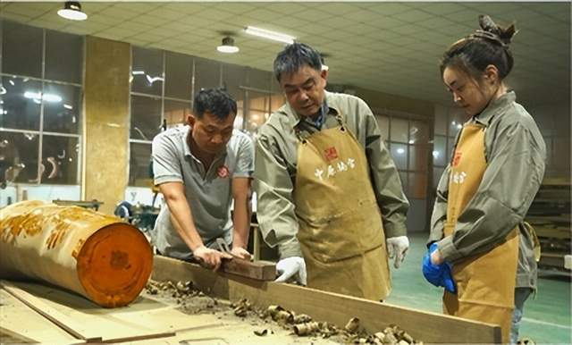 河南省许昌市中原楠宫金丝楠博物馆创始人宋松继(中)为团队成员讲解金丝楠木打磨细节。