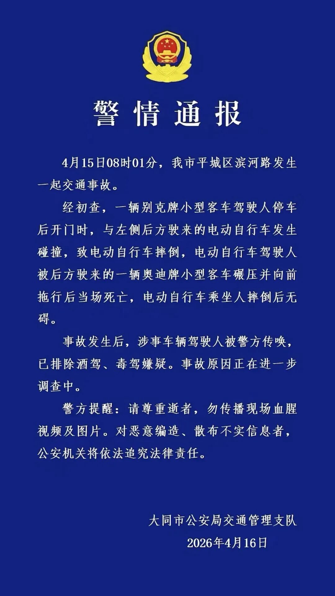 4月15日8时01分,大同市平城区滨河路发生一起交通事故。经初查,一辆别克牌小型客车驾驶人停车后开门时,与左侧后方驶来的电动自行车发生碰撞,致电动自行车摔倒,电动自行车驾驶人被后方驶来的一辆奥迪牌小型客车碾压并向前拖行后当场死亡,电动自行车乘坐人摔倒后无碍。