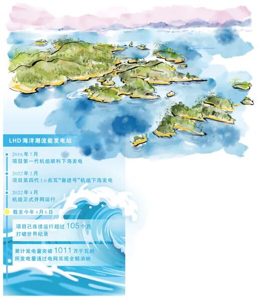 LHD海洋潮流能发电站是我国自主研发的潮流能发电项目。2016年7月,项目第一代机组在舟山顺利下海发电。此后经过迭代优化,2022年2月,项目第四代1.6兆瓦“奋进号”机组下海发电,成为我国首台兆瓦级潮流能发电机组,也是目前国际上单机容量最大的潮流能发电机组;同年4月,该机组正式并网运行。