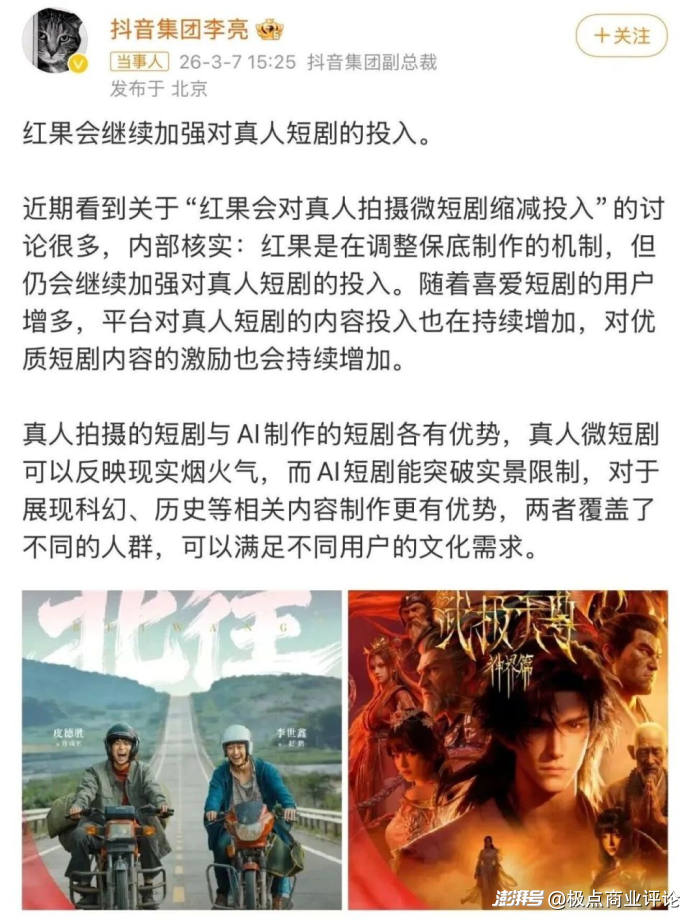 作为行业头部,红果短剧的调整,是整个赛道的风向标杆。面对市场谣言与行业恐慌,红果短剧总编辑乐力、抖音集团副总裁李亮先后公开辟谣,明确否认缩减真人短剧投入的传闻,强调平台对真人内容的扶持力度只会加码、不会减弱。