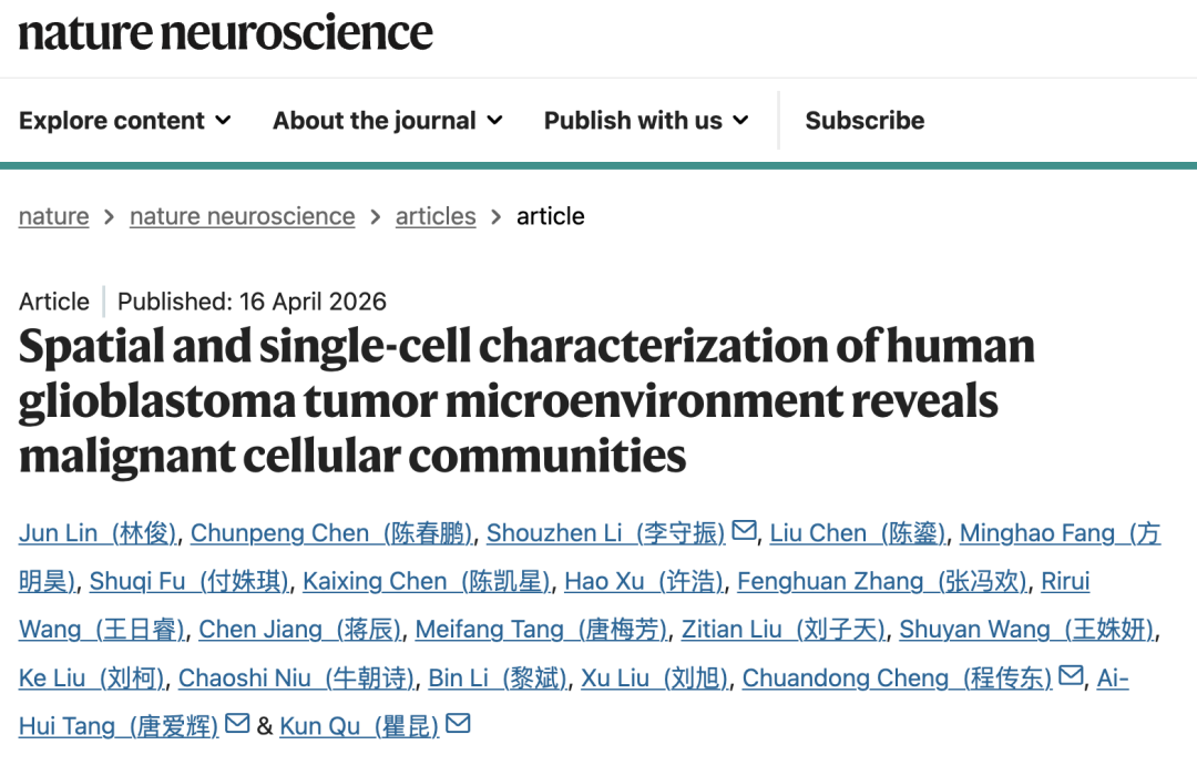 2026 年 4 月 16 日,中国科学技术大学瞿昆教授、唐爱辉教授、程传东主任、李守振副研究员作为共同通讯作者(林俊、陈春鹏为论文共同第一作者),在 Nature Neuroscience 期刊发表了题为:Spatial and single-cell characterization of human glioblastoma tumor microenvironment reveals malignant cellular communities 的研究论文。