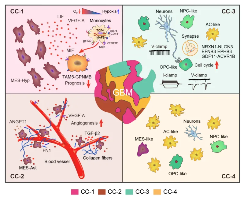 该研究确定了四个恶性细胞群落——CC-1 为缺氧核心区,富集 MES 样肿瘤细胞与单核细胞来源的肿瘤相关巨噬细胞;CC-2 为血管富集区,以内皮细胞、周细胞等血管细胞为特征;CC-3 为神经元富集区,汇聚 OPC 样、NPC 样肿瘤细胞与神经元;CC-4 则以 AC 样肿瘤细胞为主。这些细胞群落在患者间表现出一致的细胞类型组成、基因表达和细胞间相互作用模式。
