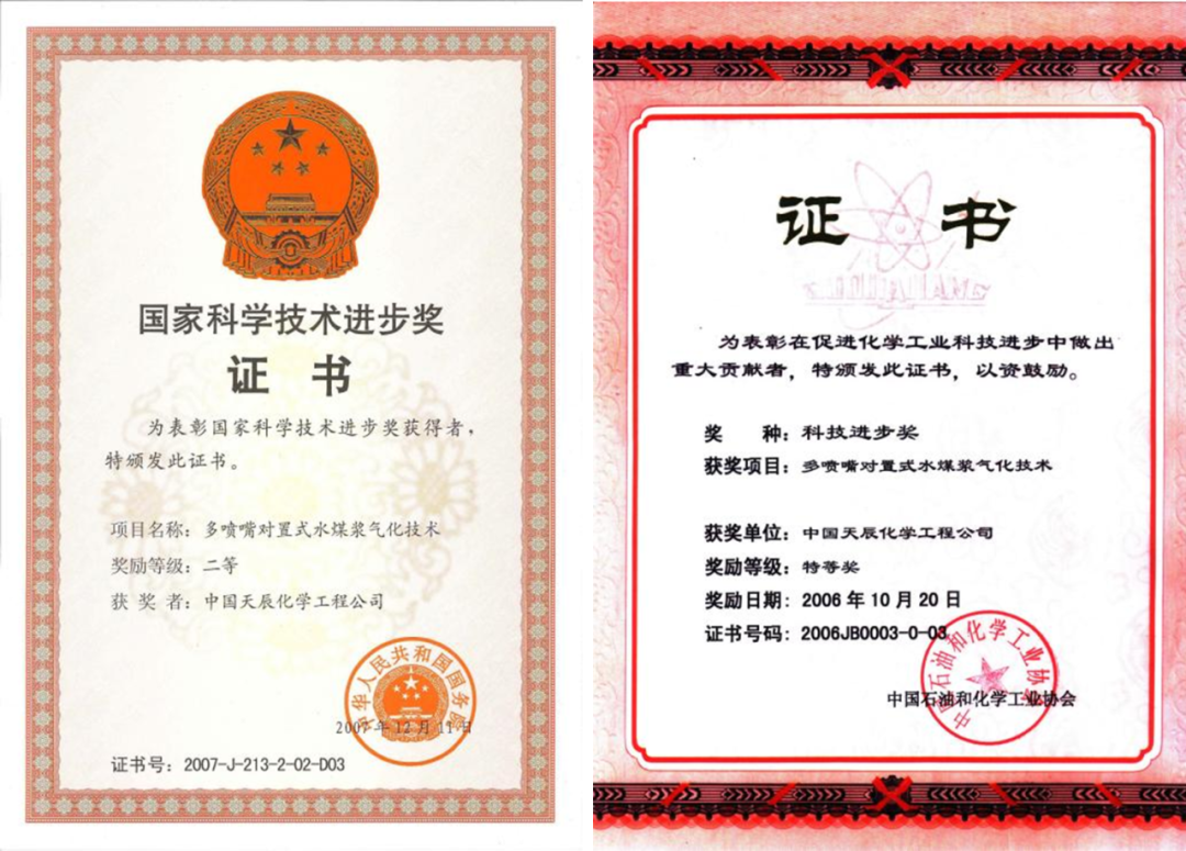 天辰公司与山东能源集团、华东理工大学联合研发的多喷嘴对置式水煤浆气化技术,打破国外技术垄断,达到国际领先水平,于2005年应用于兖矿国泰年产20万吨醋酸和日处理1000吨煤新型气化炉工程项目,该项目于2009年获评“新中国成立60周年100项经典暨精品工程”。目前,该技术已在全国数十个大型煤化工项目中成功应用,投产单炉日投煤量可达4000吨,荣获国家科学技术进步二等奖、国家优质工程金质奖、石化行业科技进步奖特等奖等多项大奖。