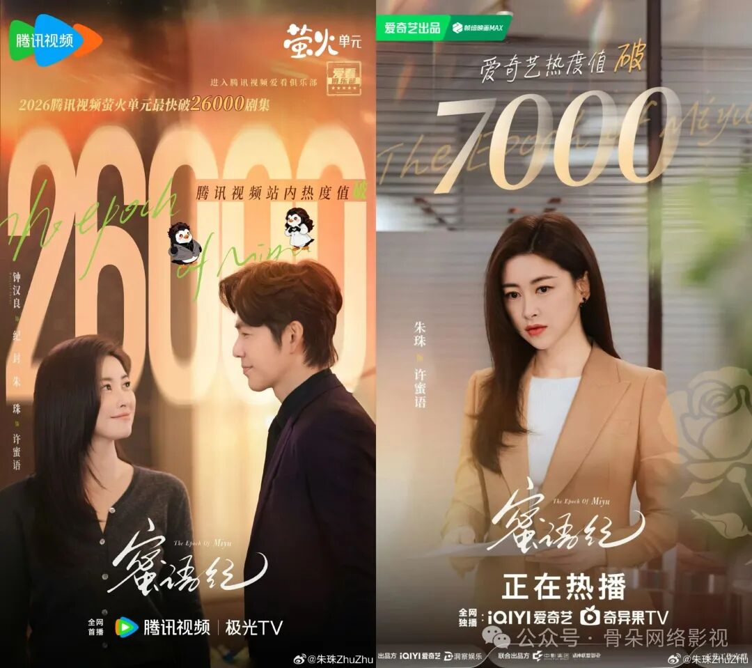 所以在长剧市场普遍冷寂的当下,《蜜语纪》还能热度炸场,刚开播就登顶骨朵电视剧热度指数排行榜,双平台开播腾讯视频热度破26500,成为2026腾讯视频萤火单元最快26000剧集,爱奇艺热度破7350;卫视端,《蜜语纪》以0.7294% 的成绩刷新2026东方卫视收视峰值记录,成为欢网卫视收视榜日冠;在抖音、微博、小红书等社交平台,《蜜语纪》的热播数据也引起了观众们的强烈表达欲:谁说长剧不行了?这不是有能支棱的吗?