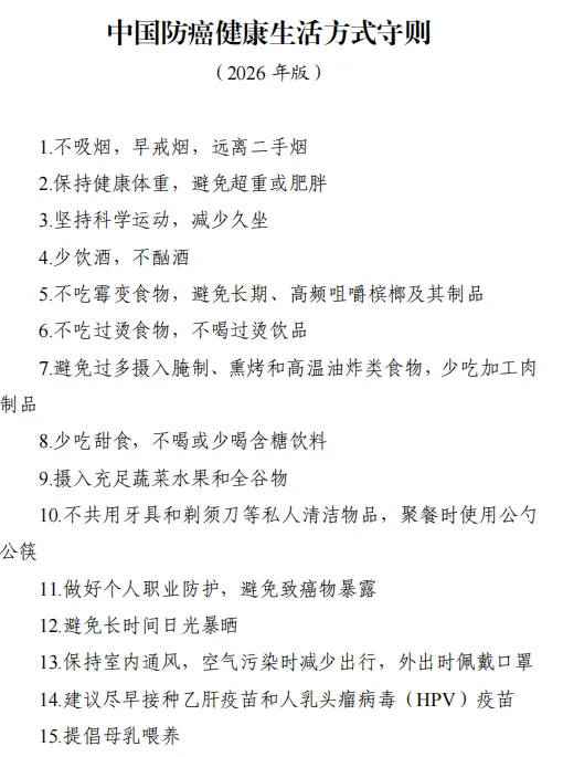 国家卫生健康委刚刚发布的《中国防癌健康生活方式守则(2026年版)》,给出了15条明确的防癌建议,把主动权交回到每个人手中。
