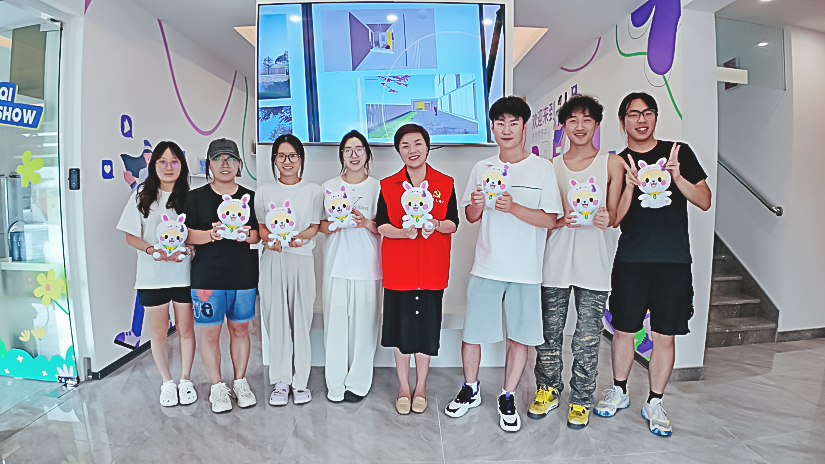 陈天燕(右四)在新建村直播基地与实习的大学生在一起