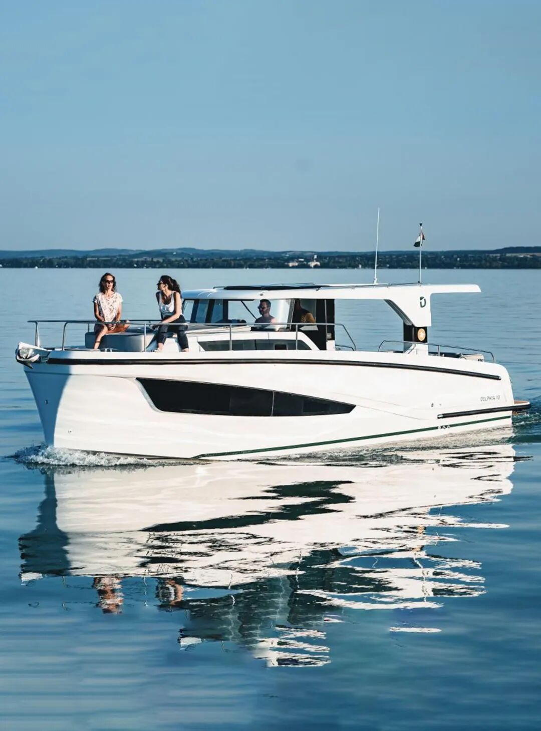德尔菲D10 Lounge Top,近十米修长船身造型,全排水型船体搭配0.8米浅吃水设计,可自在穿梭于内河湖湾与近海沿岸,2.5米水线上高度更可从容穿越多数限高桥梁。动力核心搭载110匹洋马柴油发动机,在5–6节的悠然航速下,1000海里的续航能力与每小时2升的超低油耗。
